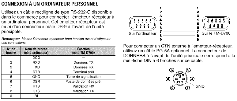 | DB 9 coté TM-D700 | DB 9 coté PC | DB 25 coté PC |