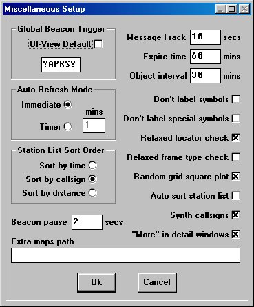 • Beacon interval : C'est ici que l'on paramètre l'intervalle d'émission des balises APRS, pour chaque type de station, il convient de mettre un intervalle en minutes qui est raisonnable, Fixed est l'intervalle d'émission pour une station fixe, 15 minutes semble être un paramétrage correcte, Mobile quand à lui est destiné aux stations mobile UI-View, la première case permet d'indiquer l'intervalle d'émission, la seconde précise la distance parcouru en miles ou kilomètres nécessaire pour qu'UI-View puisse passer en émission avant l'intervalle, le paramétrage Internet est identique à Fixed, sauf que celui-ci alimente l'APRServe.