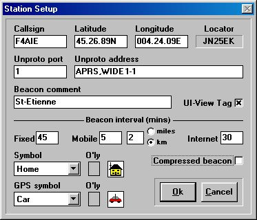• Icônes : La première nommée Symbol vous permet de représenté votre station fixe, il convient donc de ne pas mettre un véhicule, ou une icône destiné à un objet APRS. La seconde icône nommée GPS Symbol représente votre station mobile, vous avez donc un GPS sur votre PC. Les champs O'ly permettent d'associer une lettre ou un chiffre à certaines icônes.