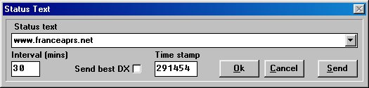 • Status text : Dans ce menu, pour une station fixe vous pouvez indiquer un peu n'importe quoi, cela peu aller de l'URL d'un site à votre e-mail personnel, vous pouvez aussi bien donné un complément d'information sur la balise beacon comment, comme le matériel utilisé. Pour une station mobile, ce champ est parfait pour indiquer votre situation, par exemple votre destination (QRD Lyon, retour QRA), votre secteur d'activité (Taxi, Livraison), le type de véhicule (Semi-remorque Rouge, Marque X bleu).