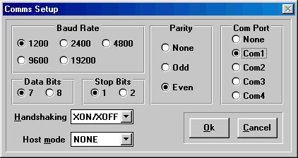 - Cliquer dans la barre des menus sur Setup, puis sélectionner Comms Setup. Vous devez obtenir un cadre. Configurer comme suit : Command File en TM-D700, Host mode en NONE, Handshaking XON/XOFF, Baud Rate en 9600 bauds, Paritity en None, Data Bits en 8, Stop Bits en 1, puis choisir dans Com Port le port que vous utilisez.