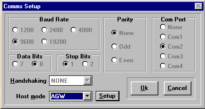 - Lancer UI-View, cliquer dans la barre des menus sur Setup, puis sélectionner Comms Setup. Vous devez obtenir un cadre, inutile de toucher les divers boutons, il suffit de cliquer sur le menu déroulant Host mode et de choisir AGW.