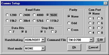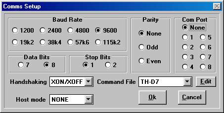- Cliquer dans la barre des menus sur Setup, puis sélectionner Comms Setup. Vous devez obtenir un cadre. Configurer comme suit : Command File en TH-D7, Host mode en NONE, Handshaking XON/XOFF, Baud Rate en 9600 bauds, Paritity en None, Data Bits en 8, Stop Bits en 1, puis choisir dans Com Port le port que vous utilisez.